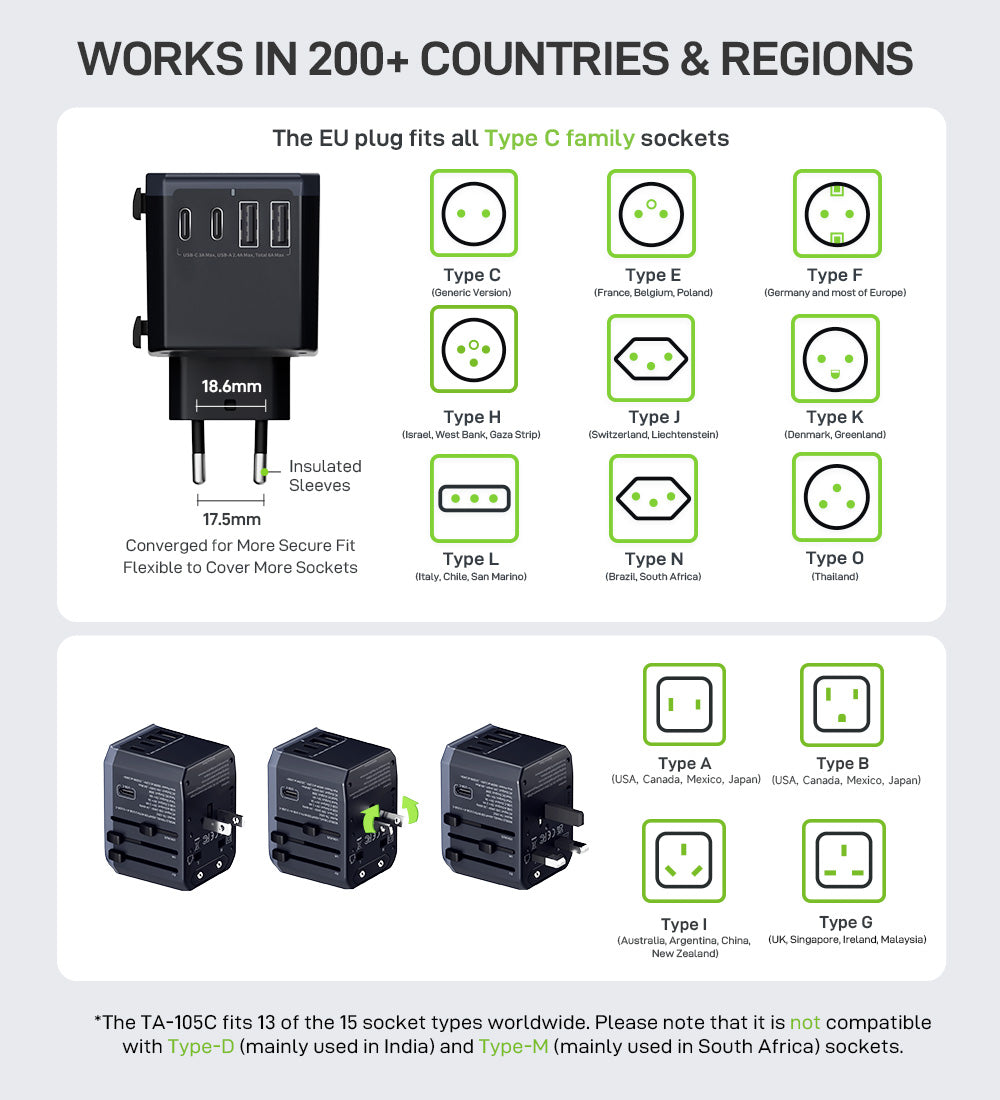 - Globale Kompatibilität: Der All-in-One-Adapter umfasst 4 verschiedene Stecker, die für über 200 Länder und Regionen geeignet sind.