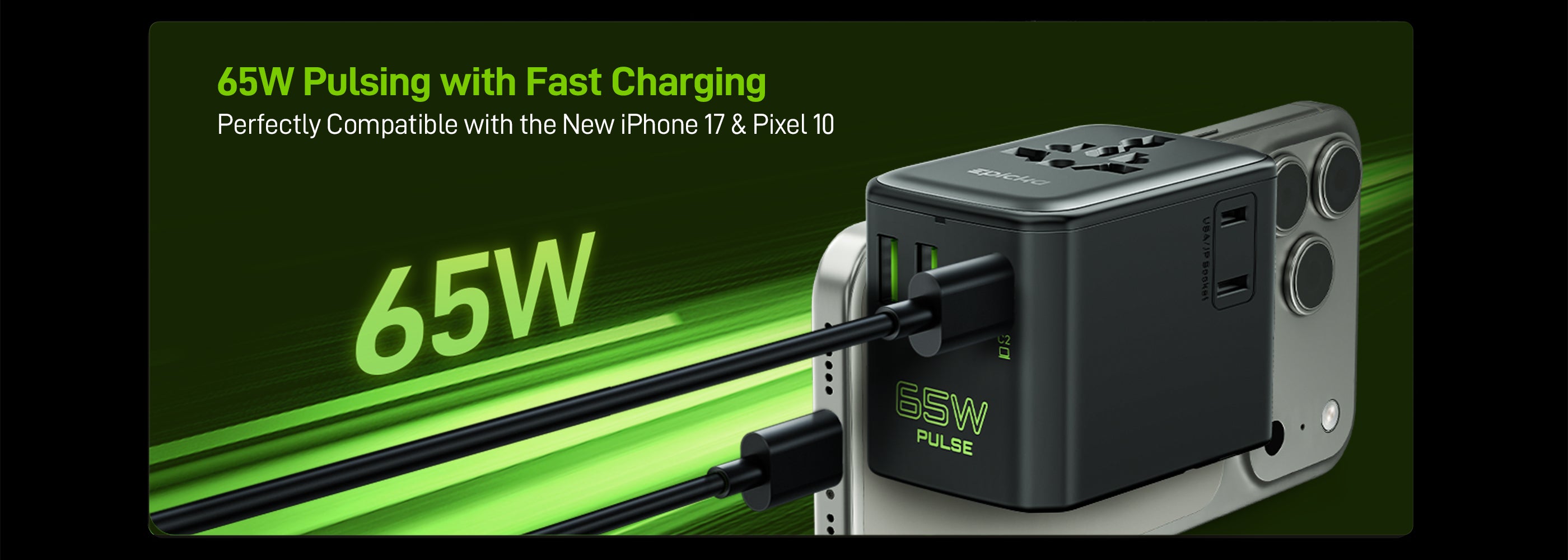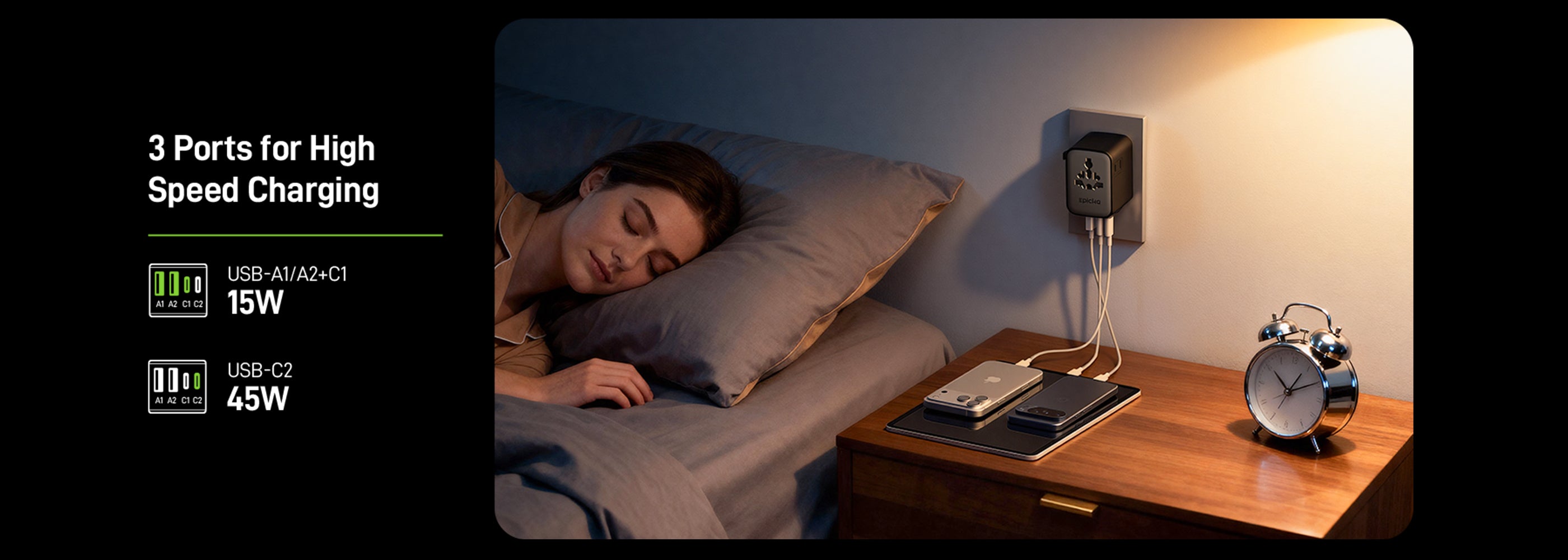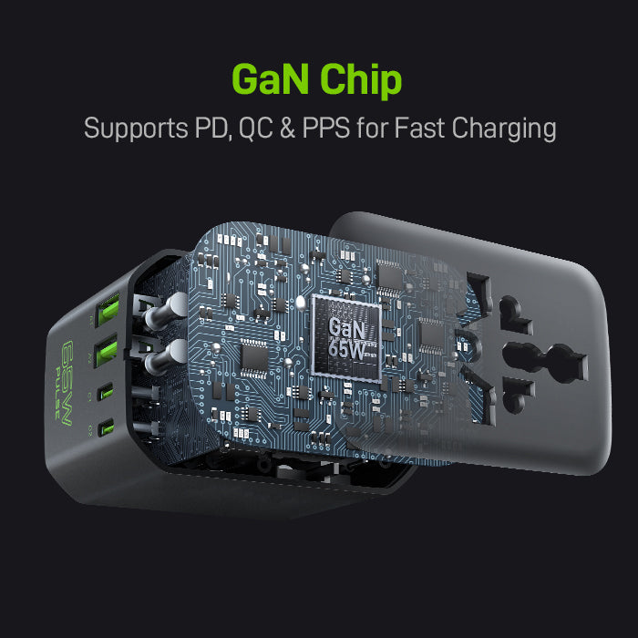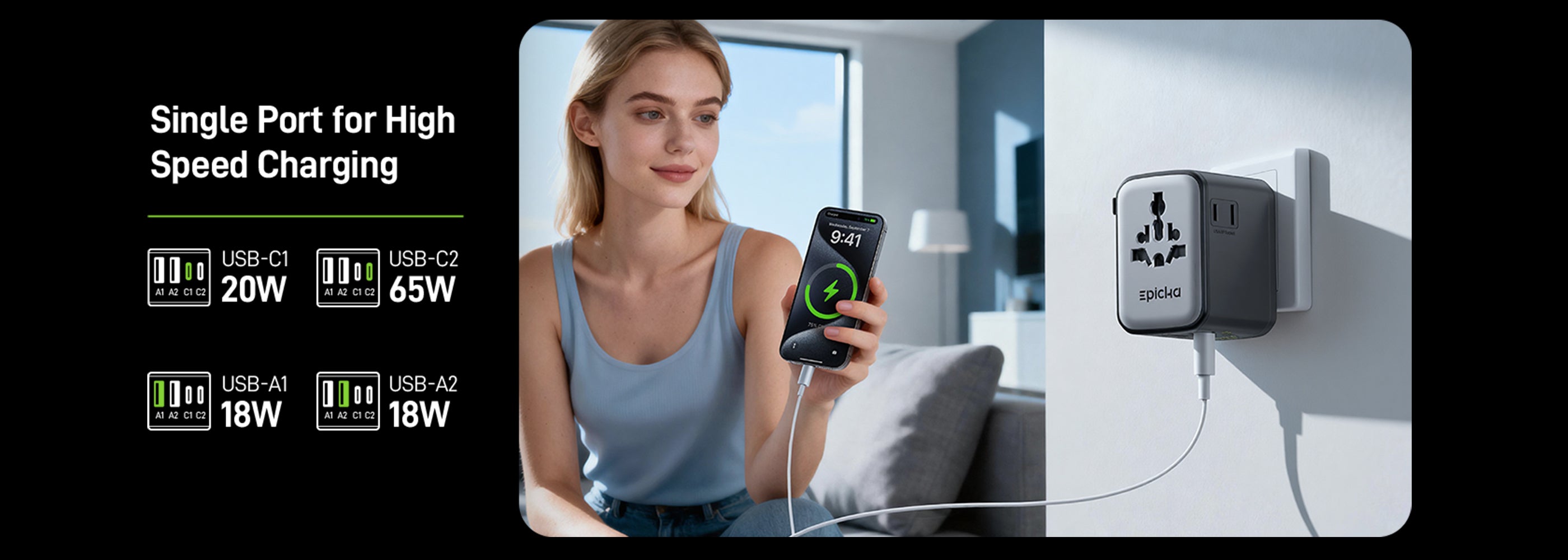• 6-in-1 Fast Charging: 2 USB-C + 2 USB-A ports, PD3.0 up to 65W, charges 6 devices simultaneously.