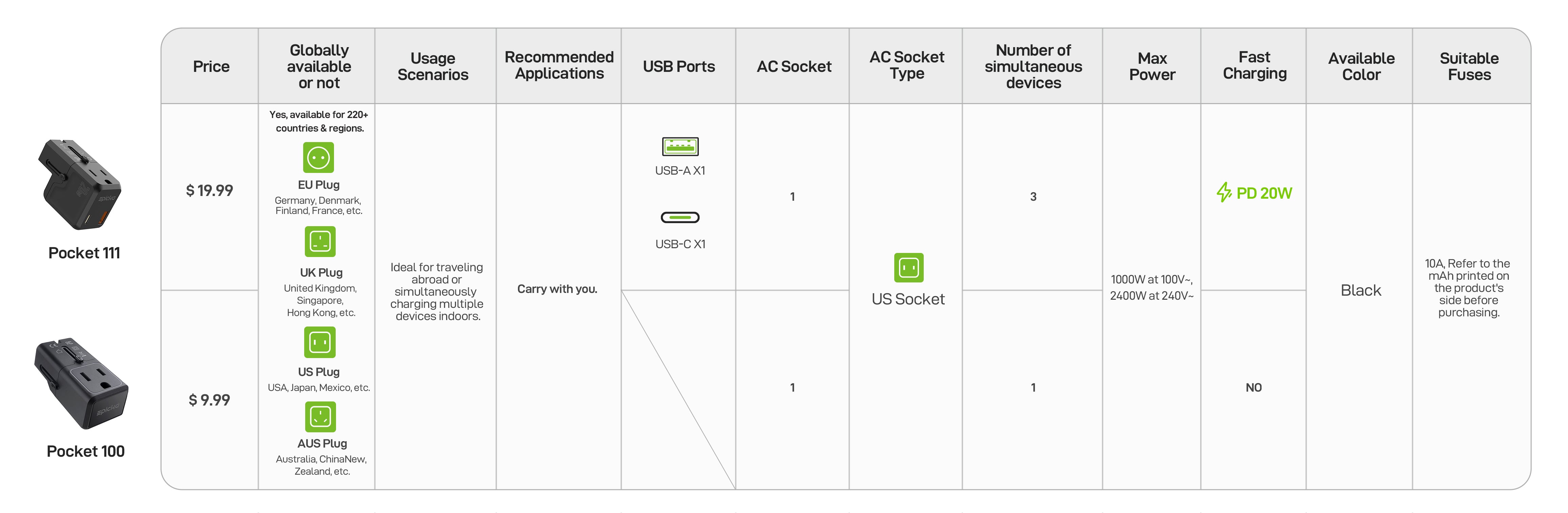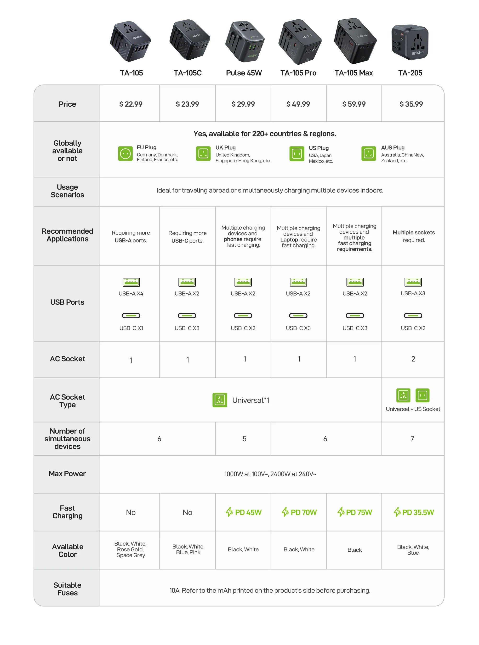 Epicka universal travel adapters are versatile and convenient. Any of these adapters can address your charging needs for multiple devices across 200+ countries and regions. You can choose the model based on different types of ports and the quantity required by your charging devices, whether you need fast charging, and the fast charging necessary power. And, of course, design or colours.