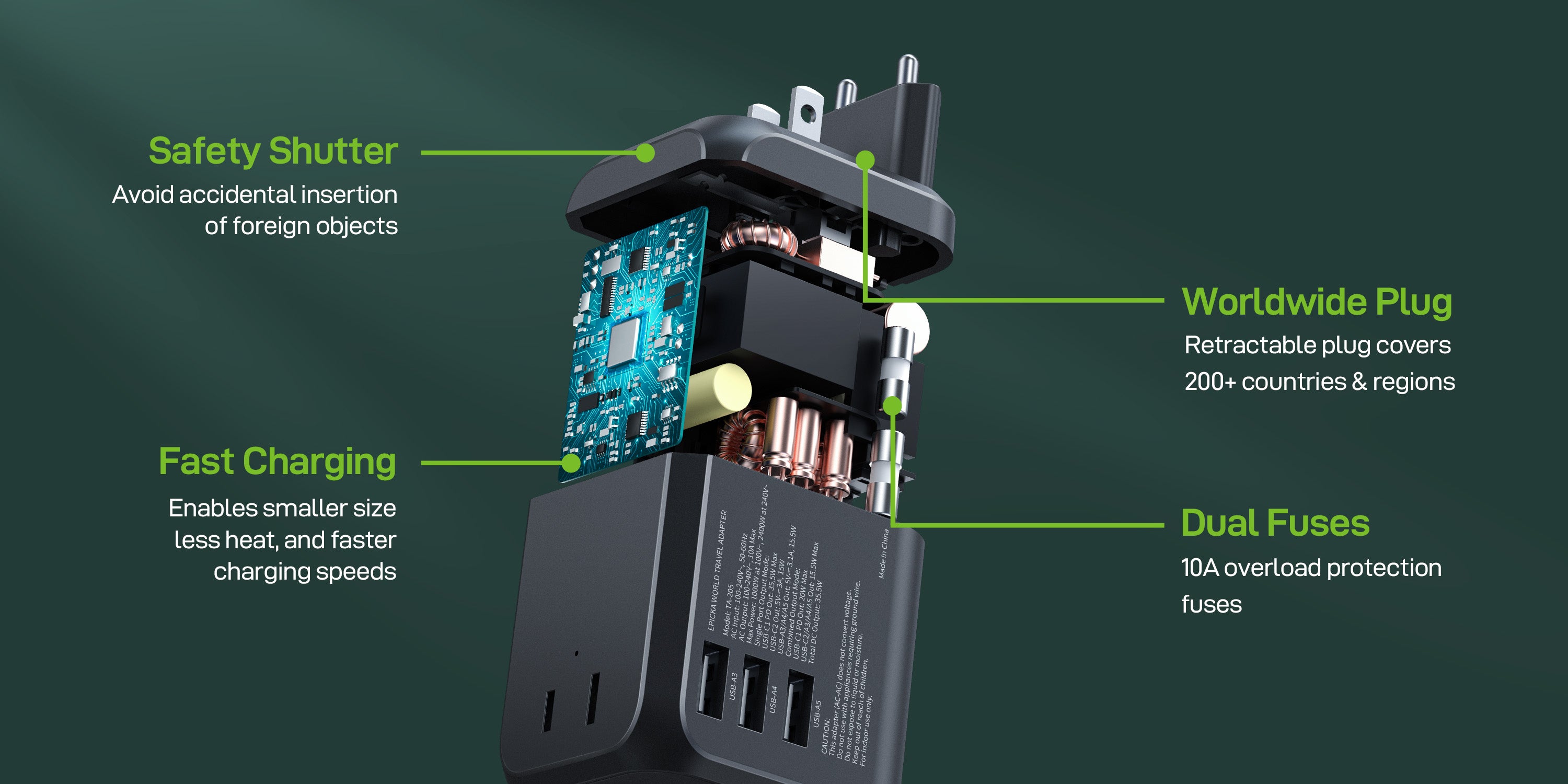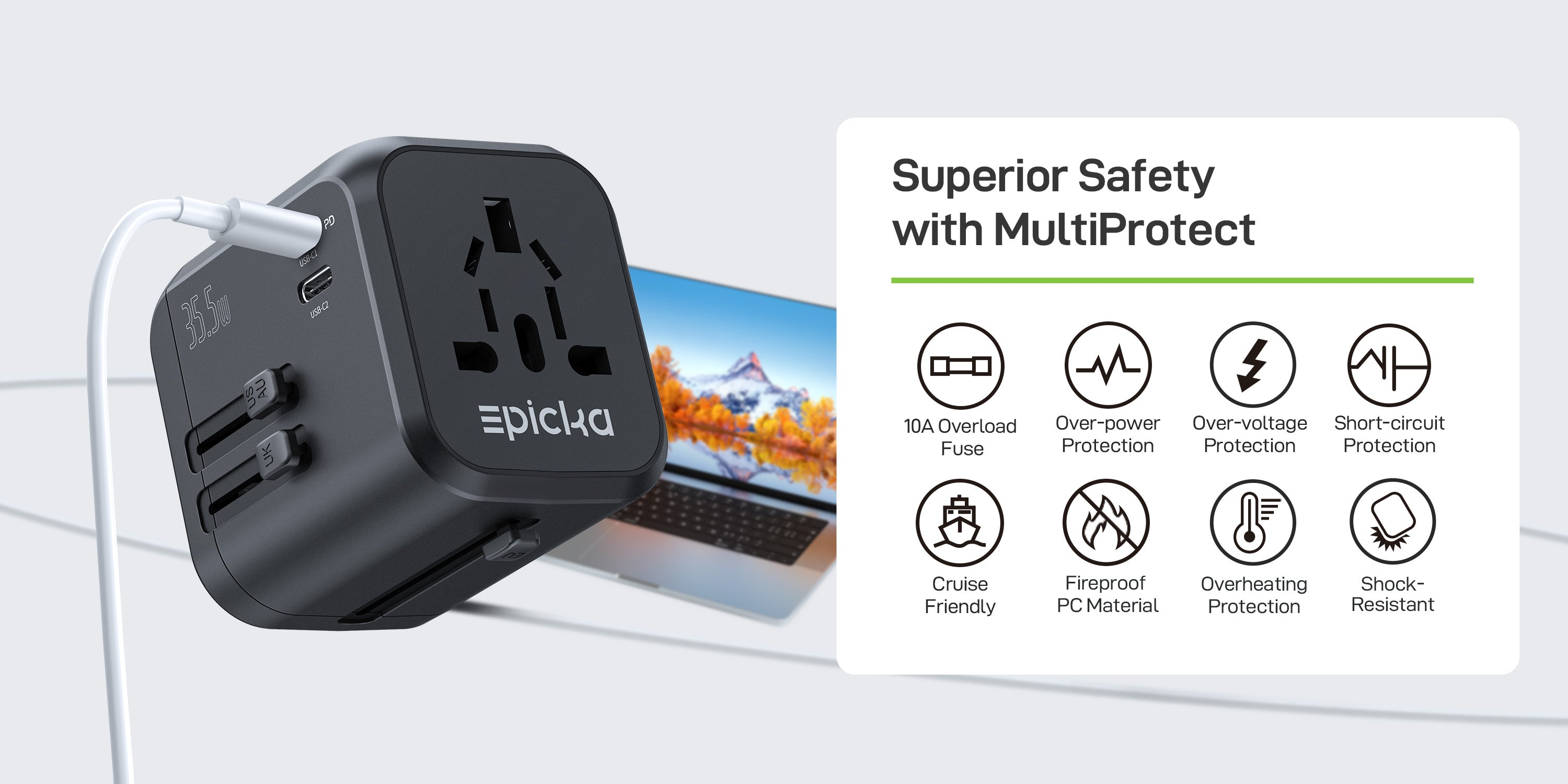 - Safety & Security: Cruise friendly. This travel adapter is equipped with a built-in 10A fuse, safety shutters and a plug lock system. In addition, it is certified by RoHS, CE, and FCC, ensuring its safety and reliability.