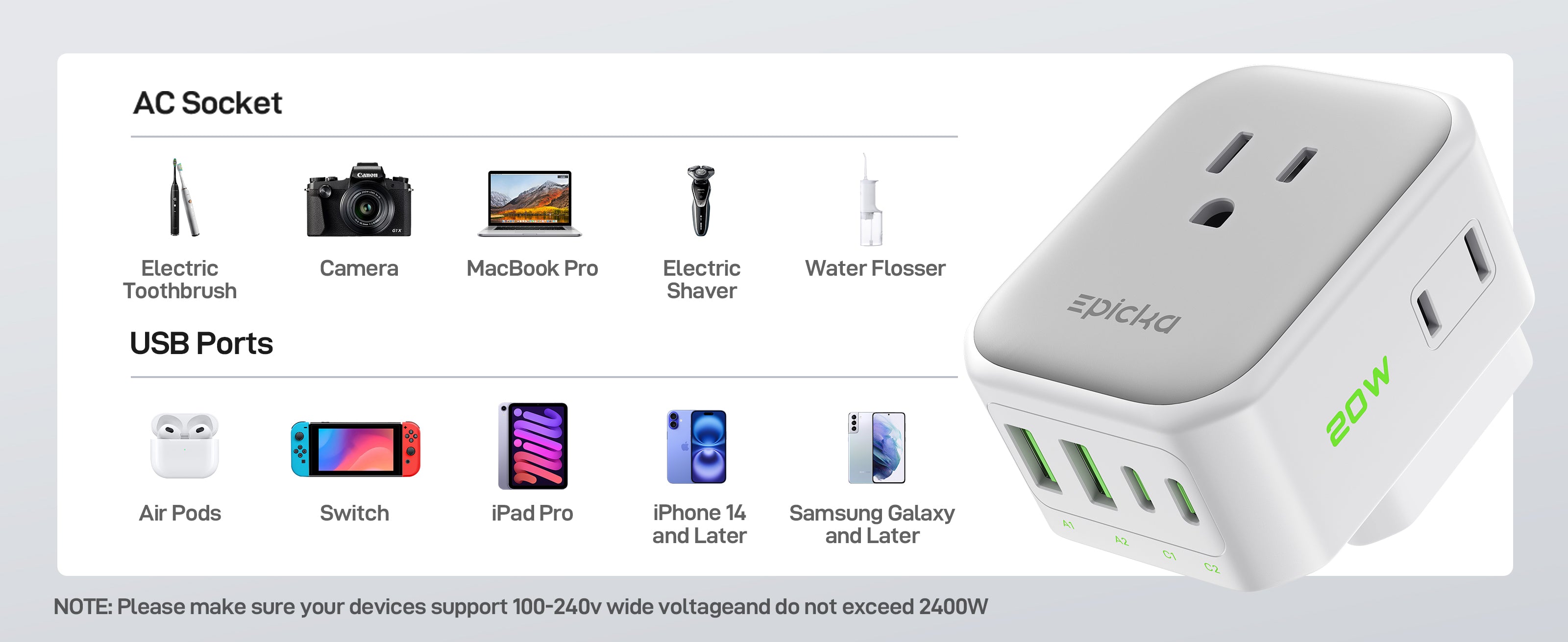 Warm Note: This Adapter is NOT A VOLTAGE CONVERTER, only supports 100-240V dual voltage products to use, especially does not support your hairdryer, hair appliance, electric toothbrush, razor and other products that need voltage convert.