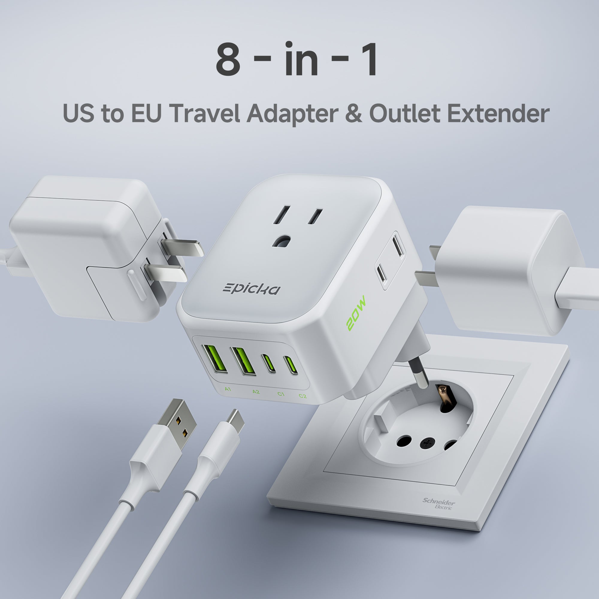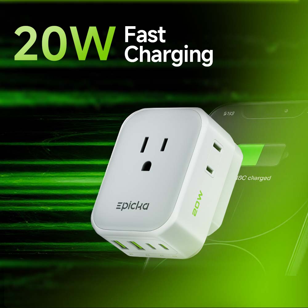 - 8-in-1 Compact Power Hub: Includes 4 AC outlets + 4 USB ports (2 USB-C), providing multiple charging options in a space-saving design.