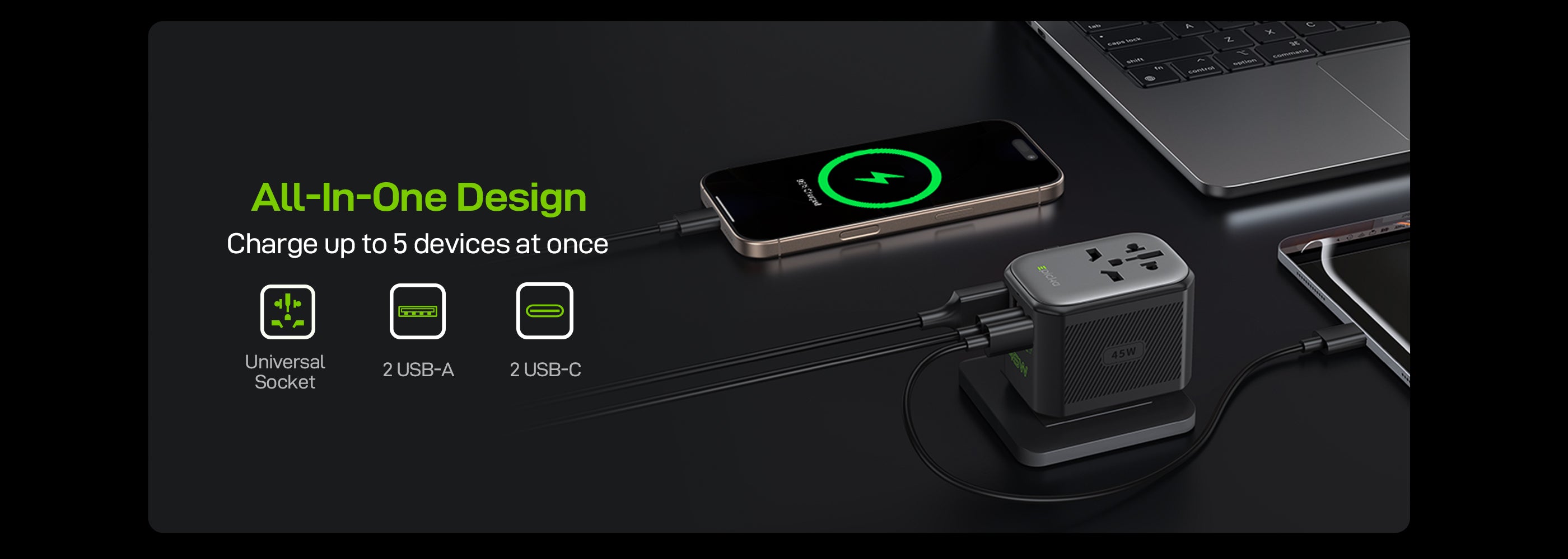 - 5-in-1 Fast Charging: 2 USB-C + 2 USB-A ports, PD3.0 up to 45W, charges 5 devices simultaneously.