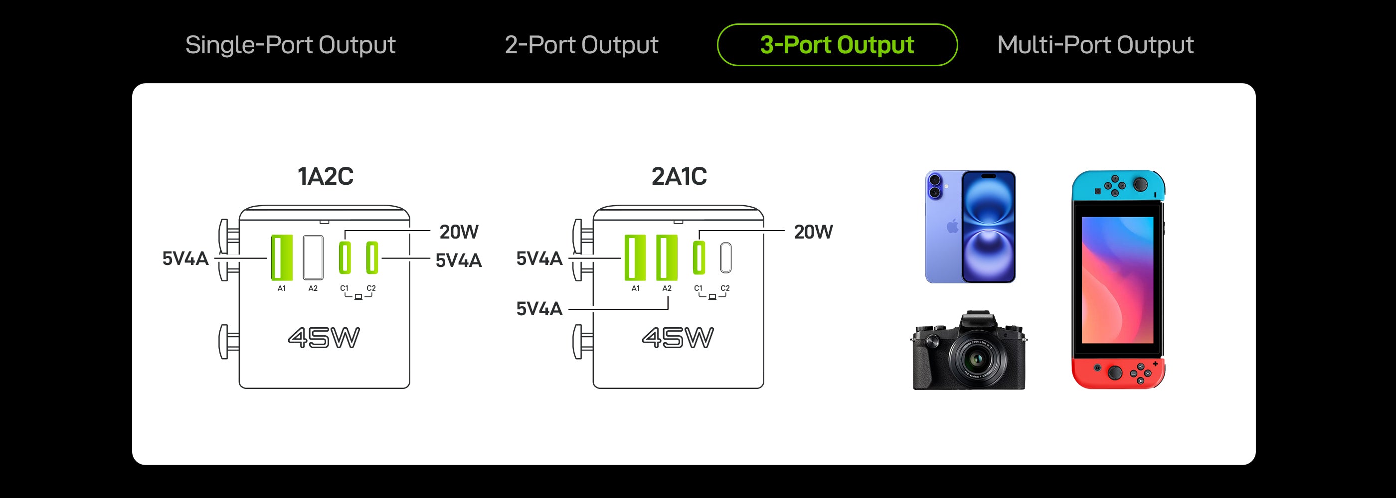 C1 Output: 5V⎓ 3A, 9V⎓ 3A, 12V⎓ 3A, 15V⎓ 3A, 20V⎓ 2.25/A, 45W Max