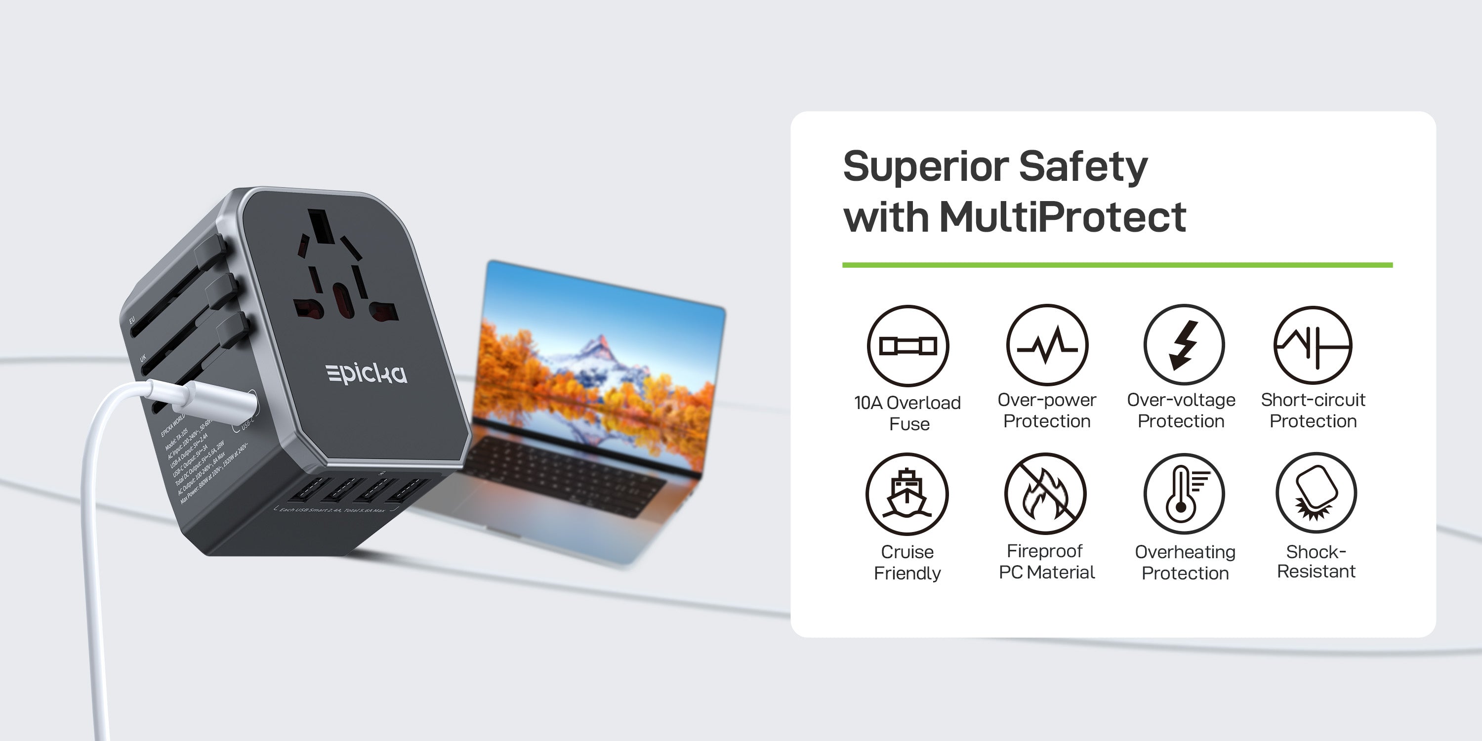 Safety & Security: Cruise friendly. This travel adapter is equipped with built-in fuse, safety shutters and plug lock system. In addition, it is certified by RoHS, CE, and FCC, ensuring its safety and reliability.
