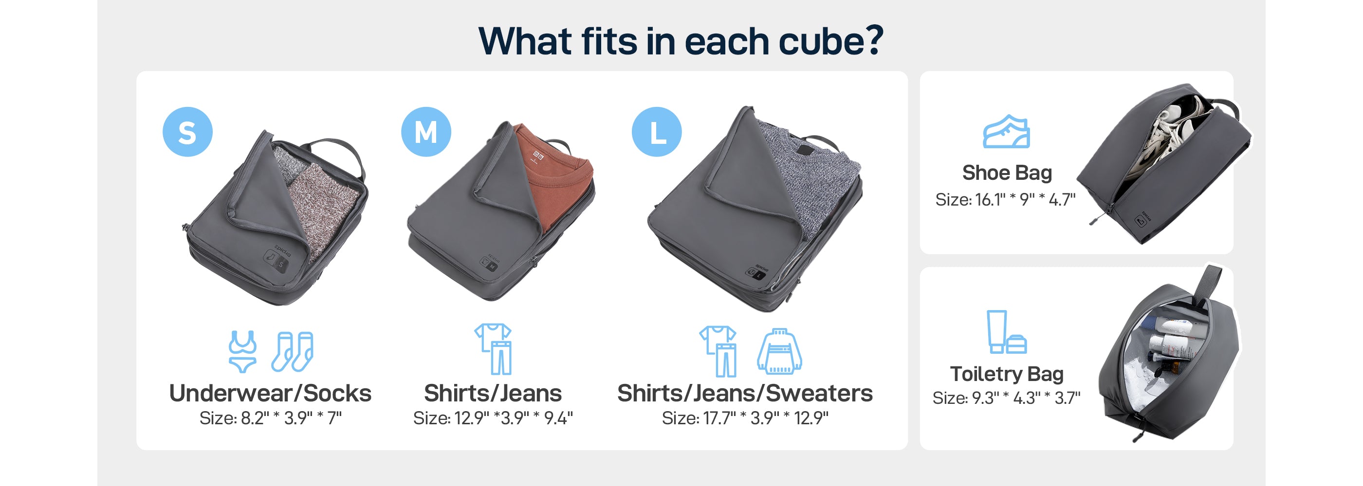 1 Small Cube, 2 Medium Cubes, 1 Large Cube, 1 Shoe Bag, 1 Toiletry Bag