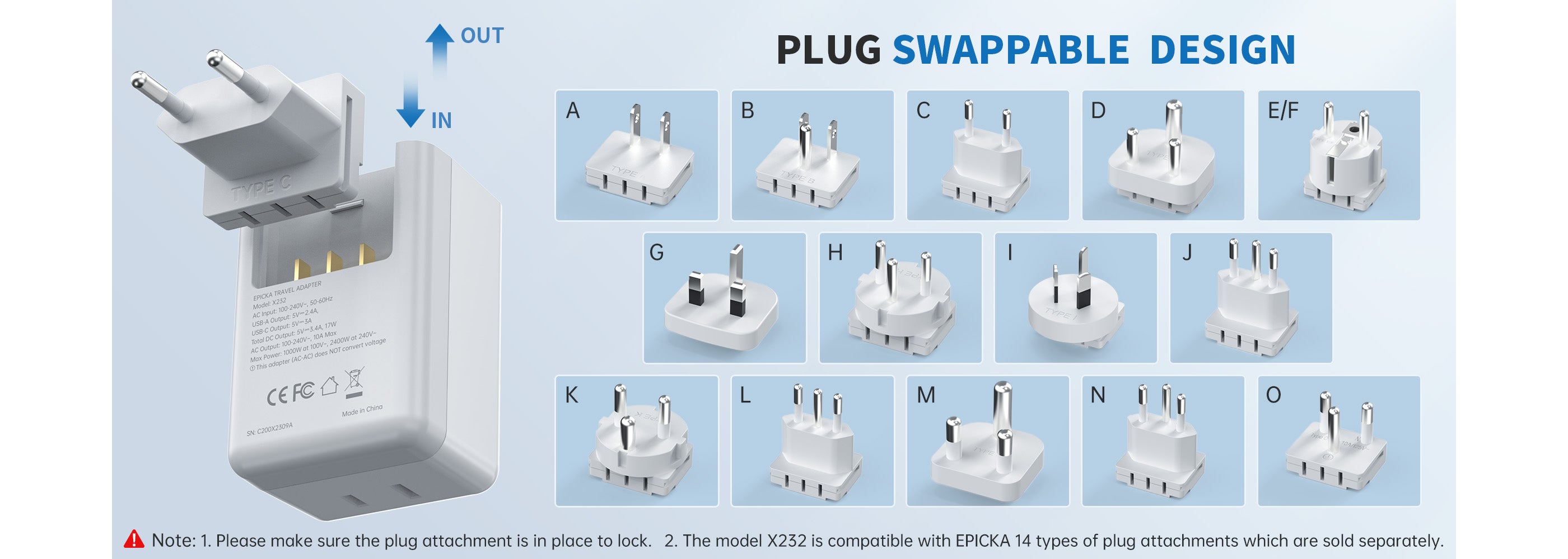 - Plug Swappable Design: With the newest swap & adapt technology, the model X232 is compatible with 14 types (E and F are the same type) of plugs worldwide. You can change it to suit different country socket types.