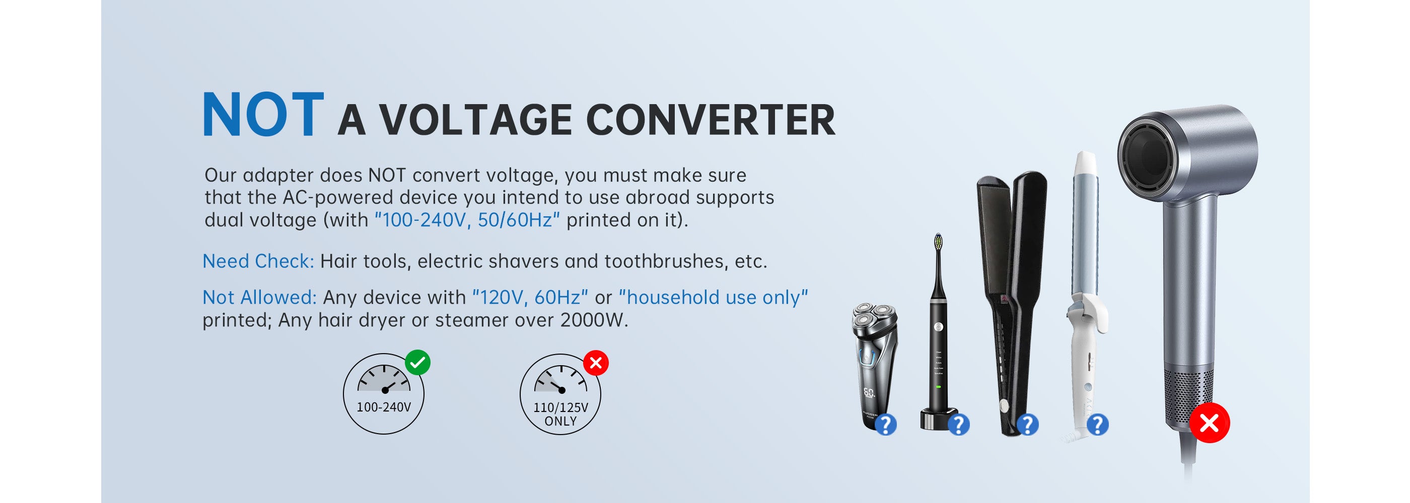 Our adapter does NOT convert voltage, you must make sure that the AC-powered device you intend to use abroad supports dual voltage (with"100-240V, 50/60Hz" specs printed on it).